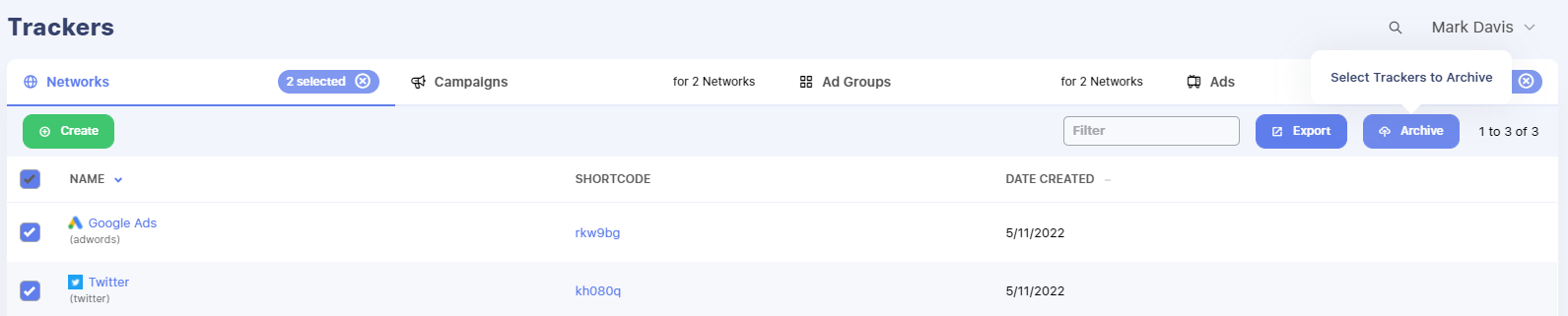 On this screen you can review / confirm the Trackers you are about to archive. Note that the archive system will also archive any children of the Trackers you selected (Ad Groups or Ads below the Campaigns selected in this example).
