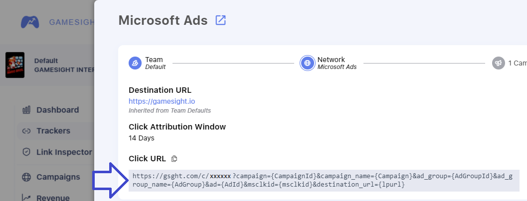 Network Tracker UsageSimply copy your full Click URL as shown above and use it in the Tracking Template field of your Campaigns in Microsoft Ads. Gamesight will automatically mirror the Campaign structure that you set up in your Microsoft Ads account. You do not need to set up the Campaign / Ad Group / Ad levels of the tracker in Gamesight.