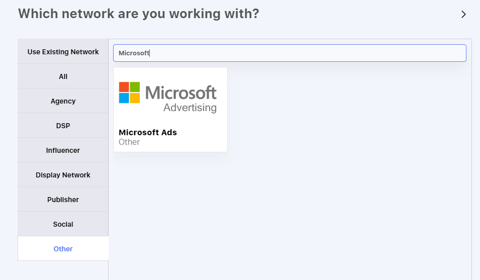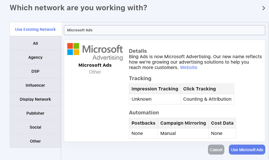 To track your Microsoft Ads Campaigns, use your network-level Microsoft Ads Click URL. You can access the correct link by clicking on your Microsoft Ads tracker on the Trackers page.